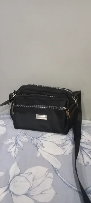 Bolso pequeño de color negro con un diseño moderno y práctico. - Compartimentos con cremallera. - Correa ajustable. - Placa metálica decorativa.
