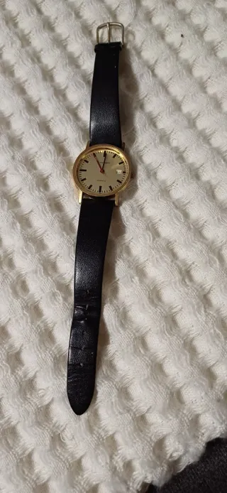 Elegante reloj de pulsera con correa negra y detalles dorados. - Esfera redonda con marcadores de hora. - Ventana de fecha. - Movimiento de cuarzo.