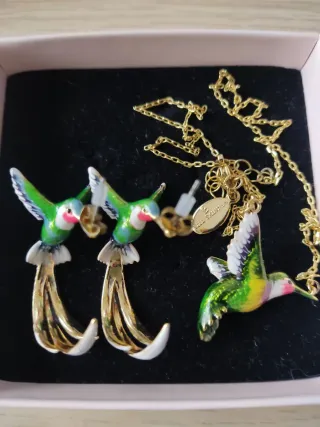 Precioso conjunto de bisutería con diseño de colibrí. - Incluye un colgante y un par de pendientes. - Detalle de esmalte en tonos verdes y dorados. Entrega EN MANO en Santiago de Compostela. NO ENVÍOS.