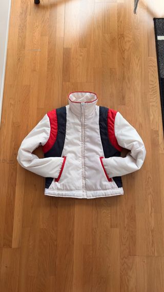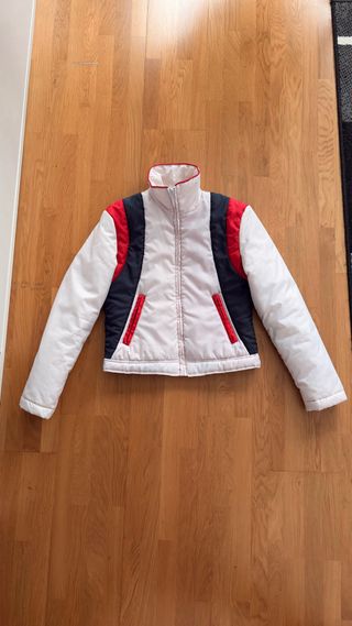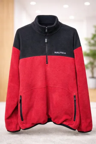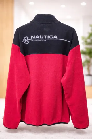 Polar Nautica talla M Usada, pero en buen estado, bicolor rojo y negro, suave y abrigado, cuello alto y bolsillos con cierre. Cómodo, ideal para uso diario o actividades al aire libre. El único detalle que tiene es la foto 4, que tiene un quemado en la manga