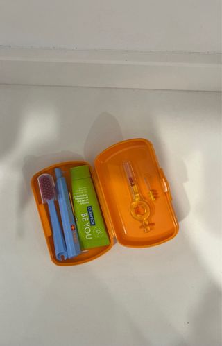 Kit de viaje que incluye cepillo desmontable, pasta de dientes y cepillo interproximal con recambio. Muy cómodo y práctico para viajar, para el trabajo o para llevar en el bolso cuando tienes alguna comida fuera de casa.
