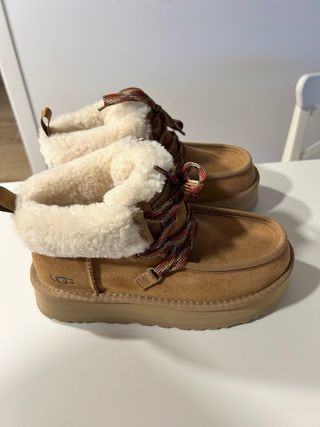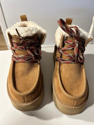 Botas de la marca UGG, modelo Funkarra. - Exterior de ante. - Forro interior de pelo. - Cordones con diseño multicolor. - Suela gruesa.