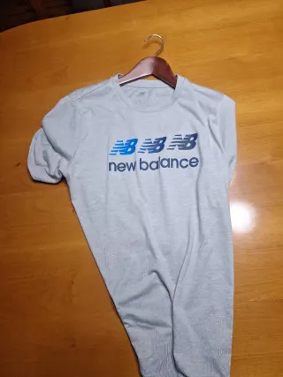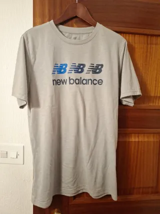 Camiseta de running New Balance en color gris, talla M. Diseñada para ofrecer comodidad y rendimiento. - Tejido técnico transpirable. - Logo de New Balance en el pecho.