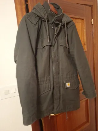 Parka Carhartt de color verde, ideal para el frío. Cuenta con capucha y múltiples bolsillos. - Cierre de cremallera y botones. - Cordones ajustables en la capucha y cintura. - Bolsillos frontales con solapa. - Logo de la marca en el bolsillo derecho.