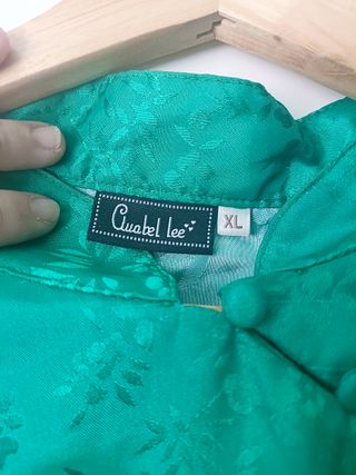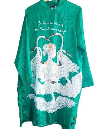 Vestido de la marca Anabel Lee con un diseño único. Vestido Plumas de Anabel Lee. Vestido de manga larga cerrada en puño y corte recto con estilo oriental. Vestido corto, con base en color verde tipo jaquard con dibujo floral. Cuello mao y abertura frontal cerrada en cruzado con botones forrados en el mismo tejido. Maxi print delantero de una diosa griega y cisnes con la frase "Es hermoso amar y ser libre al mismo tiempo". - Estampado de cisnes y una figura femenina. - Escrito en la parte superior: Es hermoso amar y ser libre al mismo tiempo. - Tejido satinado con un ligero relieve. Sólo lo puse una vez y muy poco tiempo.