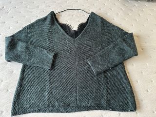 Jersey de punto de Vero Moda, talla M, en color verde oscuro. Tiene escote en pico delantero y trasero, y un detalle de puntilla que se puede llevar delante o en la espalda, según cómo lo coloques. Muy versátil y original. 🧶 Tejido suave y agradable 👚 En estado perfecto 🚚 Envío rápido Ideal para looks casuales o más arreglados.