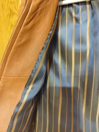 - 100% Piel genuina de cordero. - Forro interior con rayas azules y doradas. - Cuello mao con cierre de botón a presión. - Cremallera frontal. - Bolsillos laterales con cremallera. - Talla 40 (talla pequeño) - Color camel - SIN ESTRENAR pero sin etiqueta