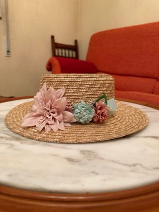 Elegante sombrero de paja, inspirado en la moda de los años 20. Perfecto para complementar un atuendo especial. - Decorado con flores de tela en tonos rosa y azul. - Cinta de tela clara alrededor de la base. Boa y collar.