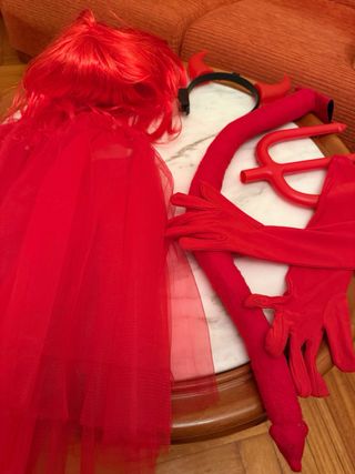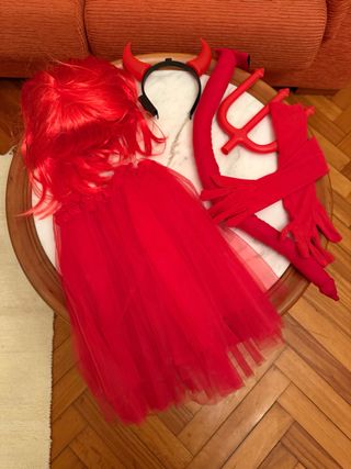 Completo disfraz de diablo para Carnaval o Halloween. Incluye todos los accesorios para un look infernal. - Diadema con cuernos rojos. - Cola de diablo. - Tridente. - Peluca roja. - Tutú rojo. También tengo medias rojas, si se quisieran añadir.