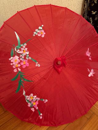Este disfraz tradicional presenta un diseño de dragones en tonos negros y rojos. La tela es satinada y tiene un acabado brillante. - Diseño de dragones. - Cierre de nudos característico. - Ribete dorado en los bordes. Incluye sombrilla.