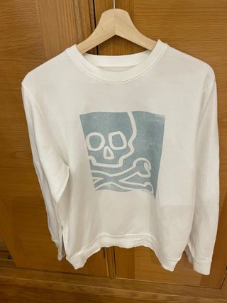 Sudadera blanca sin etiquetas, corresponde a una talla S . Medidas en las fotos . Tiene una mancha que apenas se aprecia en una manga . - Estampado en color azul claro. - Cuello redondo. - Manga larga.