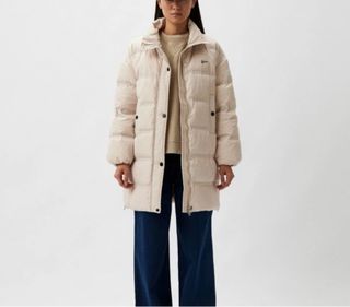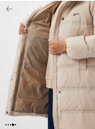 Abrigo largo acolchado de la marca Bimba y Lola. Se usó dos veces. - Color beige. - Diseño moderno y cálido. - Cierre de cremallera y botones a presión.