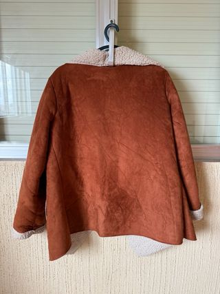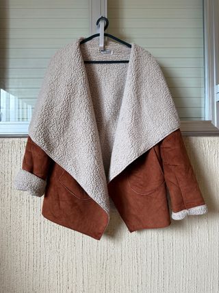 Abrigo de estilo moderno. - Exterior de ante sintético en tono marrón. - Interior de borreguito suave en color beige. - Corte abierto con solapas amplias. - Puños y bajo con detalle de borreguito.