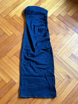 Vestido largo de tela vaquera, con un diseño sin tirantes. - Largo hasta los tobillos. - Tejido denim. - Silueta ajustada.