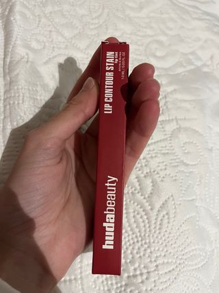 Este es el Lip Contour Stain de Huda Beauty en el tono Cinnamon. Lo tengo igual y no es tan rojo, es entre rojo y marron.