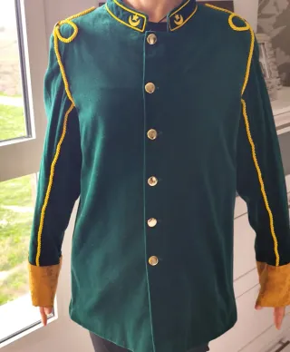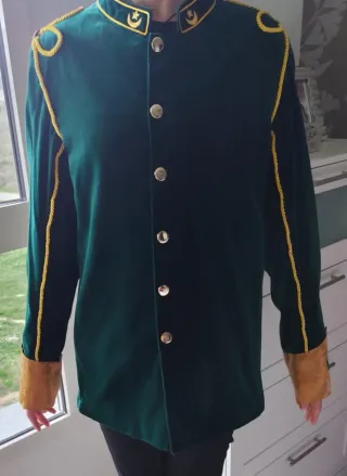 Prenda de estilo turco, ideal para eventos especiales. - Color verde intenso. - Adornos dorados en cuello, hombros y puños. - Botones dorados. - Tejido de terciopelo.