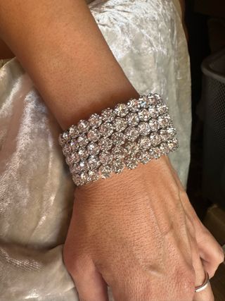 Elegante pulsera adornada con múltiples filas de piedras brillantes. - Diseño llamativo y sofisticado. - Acabado metálico plateado. - Ideal para bodas y eventos