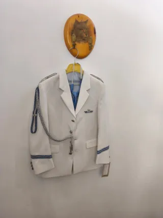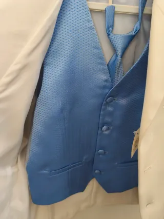 Conjunto de traje marinero para primera comunión. - Chaleco azul con textura. - Corbata a juego. - Chaqueta blanca. Tiene unas manchas en el pantalón pero se puede quitar