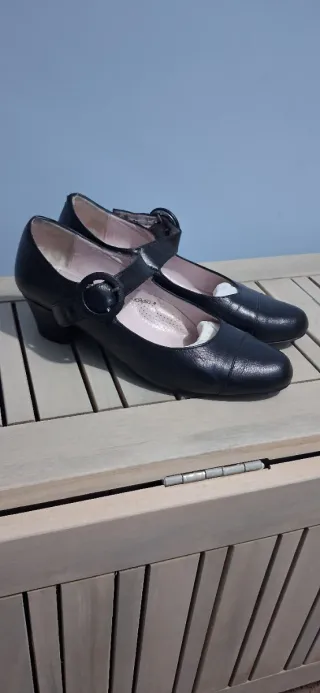 Elegantes zapatos de piel. - Material: Piel. - Color: Negro. - Diseño con tira y hebilla. - Suela interior con logo de la marca.