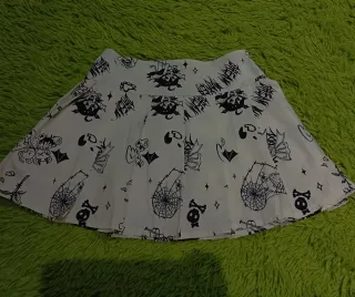 Falda corta con un divertido estampado gótico. - Diseño de calaveras, telarañas y murciélagos. - Estampado en blanco y negro. - Estilo skater con vuelo.