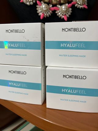 Set de cuatro mascarillas faciales Montibello Hyalufell. - Mascarilla de agua para dormir. - Hidratación intensiva.
