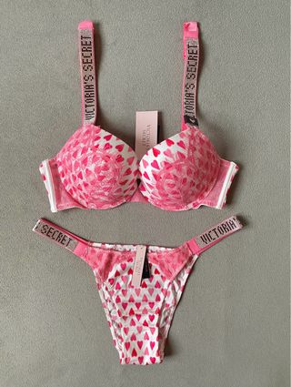 Conjunto lenceria: Sujetador Push Up y Braga brasileña con encaje. Logo con brillantes. Marca: Victoria’s Secret (VS). Sujetador Talla: - EU: 75B - USA: 34B - ESPAÑA: 90B - ITALIA: 2B Braga brasileña: M. Color: Rosa y blanco. Corazones y encaje rosa. Nuevo a estrenar con la etiqueta! Con la bolsa de la marca de las fotos. Precio NO negociable! Posibilidad de hacer un lote de productos en un mismo envío. Tags: picardias, tanga, corset, corpiño, pijama, top, liga, liguero, bata, bolso, tarjetero, cartera, monedero, llavero, neceser