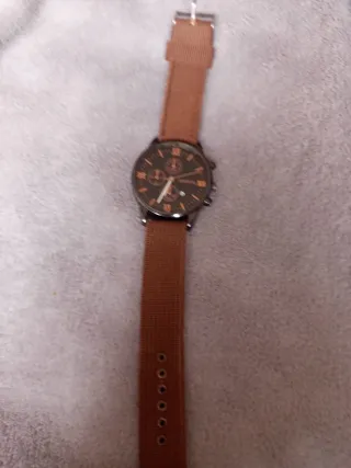 Elegante reloj de pulsera con correa de tela. - Esfera con números romanos. - Correa de tela marrón. - Detalles en dorado.