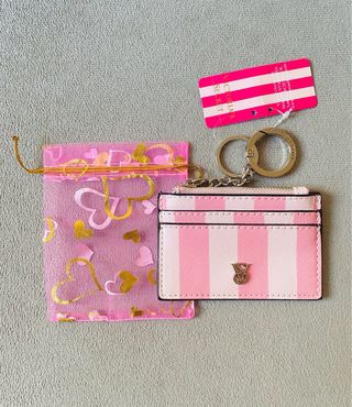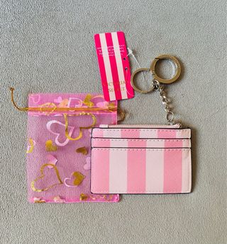 Tarjetero. Llavero. Monedero. Marca: Victoria‘s Secret VS. Color: Rosa. Rayas. Mosquetón con logo plateado. Lleva un compartimento con cremallera. Nuevo, con la etiqueta. Incluye la bolsita de tela de regalo. !! Precio NO negociable !! Tags: complementos, bolso, maletín, bolsito, estuche, mujer, bolsa, billetera, moda, maleta, pendientes, cinturon, estuche, cartera, vanity set, neceser, saco, crossbody, sujetador, tanga, pijama, braga, picardías, conjunto, lencería