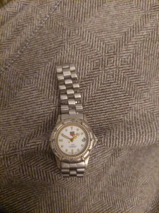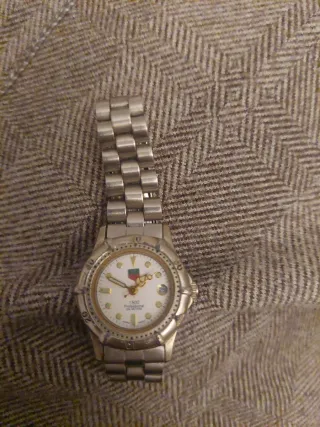 Reloj TAG Heuer modelo 1500 Professional. - Esfera blanca con detalles dorados. - Bisel giratorio. - Correa de acero inoxidable. - Resistencia al agua de 200 metros.