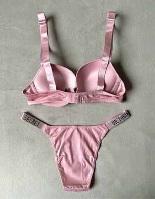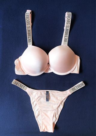 Conjunto lenceria: Sujetador Push Up + Braga brasileña. Logo con brillantes. Marca: Victoria’s Secret (VS). Sujetador Talla: - EU: 75B - USA: 34B - ESPAÑA: 90B - ITALIA: 2B Braga brasileña: M (talla pequeño, sirve para talla S). Color: Rosa claro. Nuevo a estrenar! Con la bolsa de la marca de las fotos. ***Posibilidad de hacer un lote de productos en un mismo envío.*** Tags: picardias, tanga, corset, corpiño, pijama, manta, liguero, bolso, top, liguero, bata, camisón, tarjetero, llavero, bolso, maleta viaje, cartera, monedero, neceser,