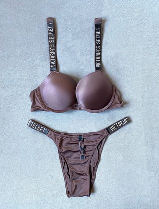 Conjunto lenceria: Sujetador Push Up + Braga brasileña. Logo con brillantes. Marca: Victoria’s Secret (VS). Sujetador Talla: - EU: 75B - USA: 34B - ESPAÑA: 90B - ITALIA: 2B Braga brasileña: M (talla pequeño, sirve para talla S). Color: Café. Brillante. Nuevo a estrenar! Con la bolsa de la marca de las fotos. ***Posibilidad de hacer un lote de productos en un mismo envío.*** Tags: picardias, tanga, corset, corpiño, pijama, manta, liguero, bolso, top, liguero, bata, camisón, tarjetero, llavero, bolso, maleta viaje, cartera, monedero, neceser,