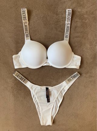 Conjunto lenceria: Sujetador Push Up + Braga brasileña. Logo con brillantes. Marca: Victoria’s Secret (VS). Sujetador Talla: - EU: 75B - USA: 34B - ESPAÑA: 90B - ITALIA: 2B Braga brasileña: M (talla pequeño, sirve para talla S). Color: Blanco. Nuevo a estrenar! Con la bolsa de la marca de las fotos. ***Posibilidad de hacer un lote de productos en un mismo envío.*** Tags: picardias, tanga, corset, corpiño, pijama, manta, liguero, bolso, top, liguero, bata, camisón, tarjetero, llavero, bolso, top, maleta viaje, cartera, monedero, neceser,