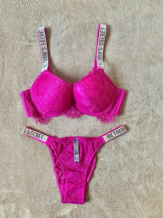 Conjunto lenceria: Sujetador Push Up + Braga brasileña. Logo con brillantes. Marca: Victoria’s Secret (VS). Sujetador Talla: - EU: 75B - USA: 34B - ESPAÑA: 90B - ITALIA: 2B Braga brasileña: M (talla pequeño, sirve para talla S). Color: Rosa metálico. Nuevo a estrenar! Con la bolsa de la marca de las fotos. ***Posibilidad de hacer un lote de productos en un mismo envío.*** Tags: picardias, tanga, corset, corpiño, pijama, manta, liguero, bolso, top, liguero, bata, camisón, tarjetero, llavero, bolso, maleta viaje, cartera, monedero, neceser,