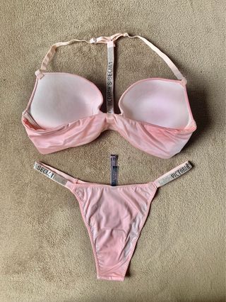Conjunto lencería / Ropa interior: Marca: Victoria’s Secret (VS). Sujetador Push Up + Braga brasileña. Tira de pedrería con brillantes en la espalda y en el tanga. El sujetador se abre y se cierra en la parte delantera. Talla Sujetador: - EU: 75B - US: 34B - ESPAÑA: 90B - ITALIA: 2B Tanga brasileño: Talla M. (talla pequeño, sirve para talla S). Color: Rosa claro brillante. Nuevo a estrenar! Con la bolsa de la marca de las fotos. ***Posibilidad de hacer un lote de productos en un mismo envío.*** Tags: pijama, bolso, llavero, maleta, pendientes, cinturon, cartera, picardias, tarjetero, monedero, tote, mochila, braga, top