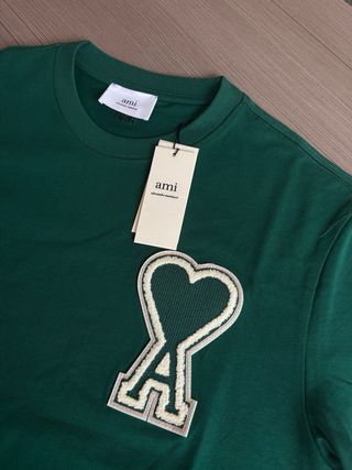 Estado: Nuevo con etiquetas 🏷️ Color: Verde Bosque / Verde Oscuro Corte: Classic Fit (Ajuste clásico) Detalles: Vendo camiseta original de Ami Paris en un color verde espectacular. Incluye el emblemático parche del corazón ("Ami de Coeur") en tamaño grande bordado en el pecho en color crema/blanco roto. • Algodón de alta calidad, muy suave al tacto. • Cuello redondo reforzado. • Nueva a estrenar, ideal para regalo o para renovar el armario con una pieza de lujo atemporal.
