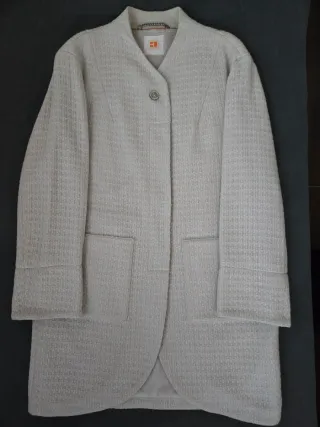 Elegante abrigo de entretiempo para mujer. - Diseño moderno, versátil y recto. - Tejido texturizado de alta calidad. - Forro interior de peluche muy suave y ligero. - Color blanco hueso. - Cierre de botón, uno a la vista y tres ocultos. - Bolsillos frontales apertura lateral - Cuello redondo sin solapa. - Hombro redondo y caído - Puesto 2 veces.