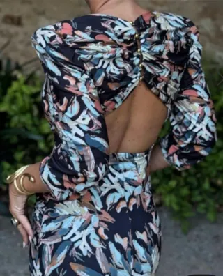 Elegante vestido de fiesta con un llamativo estampado. - Diseño con escote pronunciado. - Mangas largas. - Corte ceñido que realza la figura. - Detalle de fruncido en la cintura.