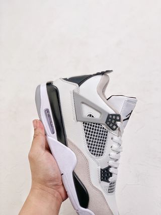 Zapatillas Jordan 4 Retro Military Black en talla 39. Un diseño icónico con una combinación de colores clásica. - Parte superior de cuero blanco y ante gris. - Detalle de malla negra en los laterales y paneles superiores. - Suela de goma blanca con detalles en negro y gris.
