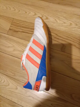 Zapatillas de fútbol sala Adidas en color naranja y blanco. - Diseño deportivo. - Cierre con cordones. - Detalle de las tres rayas de Adidas.