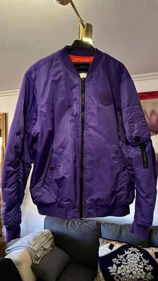Chaqueta estilo bomber de la marca Pull&Bear en color morado. Presenta un diseño moderno y detalles característicos de este tipo de prenda. - Cierre frontal de cremallera. - Bolsillos laterales. - Detalle de parche circular en la manga. - Puños y cintura elásticos.