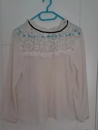 Elegante blusa de manga larga con detalles de encaje en el pecho y cuello. - Cuello alto con volante. - Encaje floral en la parte superior. - Cierre con lazo en el cuello. Atrás.