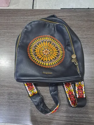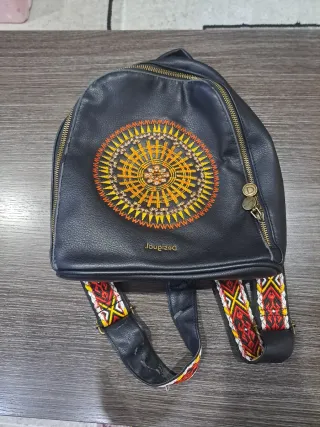 Mochila Desigual con un diseño llamativo. Desgastada pero conservada - Color principal negro. - Adorno frontal con bordado circular en tonos naranjas y amarillos. - Correas con estampado étnico multicolor.