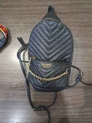 Mochila pequeña de Victoria's Secret con un diseño acolchado y detalles de tachuelas. Tiene algún signo de desgaste los.que se ven en la.foto - Diseño acolchado en chevron. - Tachuelas doradas. - Cadena dorada decorativa en el bolsillo frontal. - Cierre de cremallera superior.