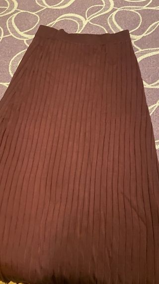 Falda midi de punto en color beige. Su diseño acanalado le da un toque moderno y elegante. - Tejido de punto suave. - Largo midi. - Cintura elástica cómoda.