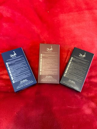 Conjunto de tres perfumes ASAD. - Incluye tres fragancias diferentes. - Cada frasco es de 50ml. - Formato Eau de Parfum.