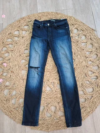 Pantalón vaquero de corte ajustado para mujer. Presenta un diseño desgastado y moderno. - Tiro alto. - Efecto desteñido. - Abertura en la rodilla.