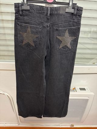 Pantalón vaquero oscuro con un diseño de estrellas brillantes. - Talla 12-13 años. - Detalle de estrellas aplicadas en toda la prenda. - Corte recto.