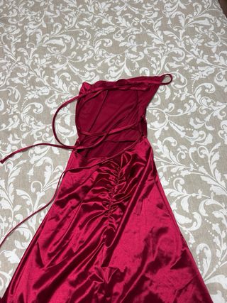 Elegante vestido de fiesta largo en tela de satén. - Color granate intenso. - Diseño con una favorecedora abertura en la pierna. - Tirantes finos y escote asimétrico.