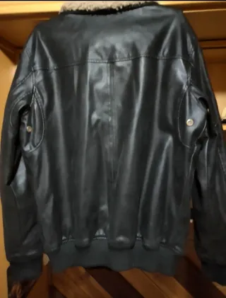 Cazadora estilo aviador con un diseño inspirado en la aviación militar. - Cuello de pelo sintético. - Parche de la 101ª División Aerotransportada en la manga izquierda. - Insignia de alas doradas en el pecho. - Bandera de EE. UU. en la manga derecha. - Bolsillo con cremallera en la manga izquierda. - Cremallera frontal dorada. - Material piel sintética con cuello extraíble de borrego. - Puesta solo un par de veces. - Talla S. - Medidas: Hombro 46 cm. Pecho o sisa 56 cm Largo 69 cm.
