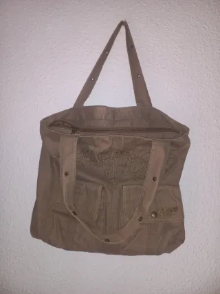 Bolso de tela en color beige con detalles bordados. - Cierre principal con cremallera. - Dos bolsillos frontales con cierre de botón. - Logo de la marca en uno de los bolsillos.